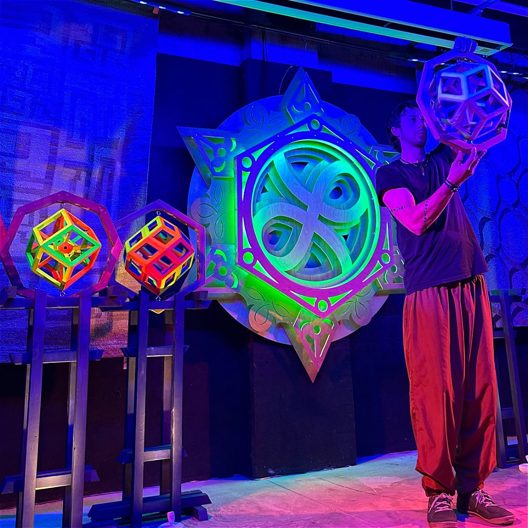 Asheville artist and airbender, Bryan Lemmel, returns to Fringe with another installment of his kinetic sculpture based performance, The Tesser Act. This installation promises the same sacred geometrical chaos magic as always on a larger scale with exciting new layers. Audience perspective is required!